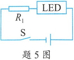 5. LED灯发光的颜色与两端的电压之间的关系如题5表所示。小科用一个150Ω的电阻$R_{1}$与LED灯串联,接在电压为6V的电源上,成功让LED灯发出了蓝光,如题5图所示。