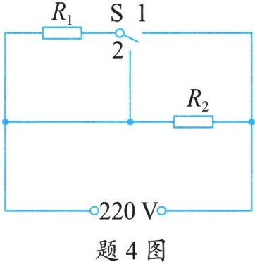 4. 如题4图是两挡空气炸锅内部加热部分的简化电路,$ R_1 $、$ R_2 $ 均为阻值为 $ 110 \Omega $ 的发热电阻,将开关 $ S $ 分别置于1、2两位置时,空气炸锅处于不同的挡位。当开关 $ S $ 置于2位置时,空气炸锅处于