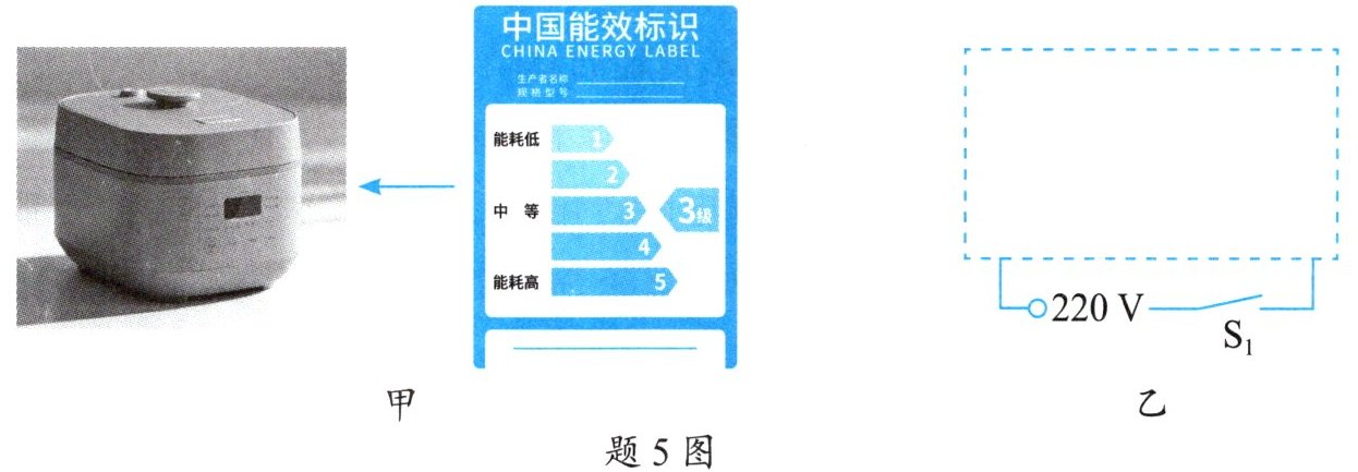 5. 如题5图甲所示的电饭锅,铭牌上附有中国能效标识,从铭牌上可知该电饭锅能效等级为3级。电饭锅的额定电压为 $ 220 V $,有“加热”和“保温”两个挡位,其内部由两个加热电阻丝 $ R_1 $、$ R_2 $ 和一个开关 $ S_2 $ 组成,研究发现:当开关 $ S_1 $、$ S_2 $ 都闭合时,只有 $ R_1 $ 工作,电饭锅处于加热状态,功率为 $ 1210 W $;当开关 $ S_1 $ 闭合、$ S_2 $ 断开时,$ R_1 $、$ R_2 $ 全部工作,电饭锅处于保温状态,功率为 $ 88 W $。