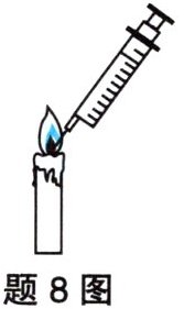 8. 蜡烛燃烧时可观察到火焰集中在烛芯周围,石蜡不断熔化,同学们对烛芯附近所含气体物质进行探究。如题8图所示,点燃蜡烛,用干燥的玻璃注射器在烛芯附近抽取气体物质。