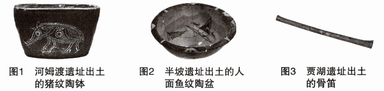 图2:半坡遗址人面鱼纹彩陶盆的出土,说明了半坡人的生活用具主要是陶器,其中最具特色的是彩陶;还能说明捕鱼是他们生产活动之一。(2分,任答一点即可)