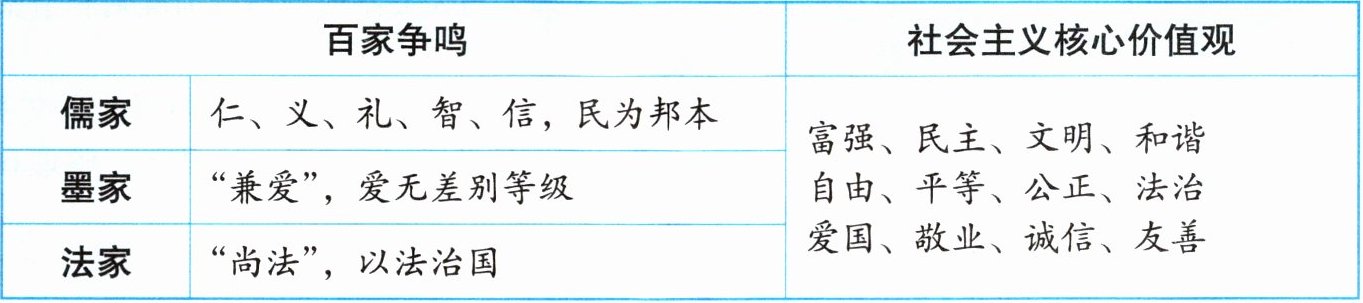 |儒家|仁、义、礼、智、信,民为邦本|富强、民主、文明、和谐|
