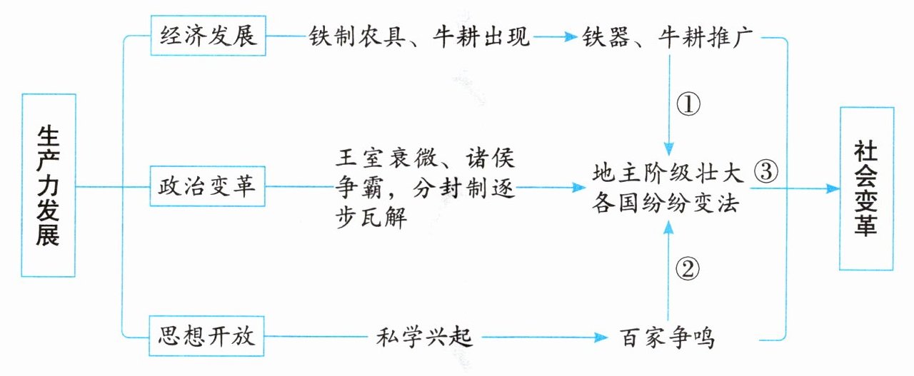 7. 根据春秋战国时期单元知识结构示意图,以秦国为例,简述图中①②③处史事之间的内在联系,并归纳这一时期历史发展的趋势。(8分)