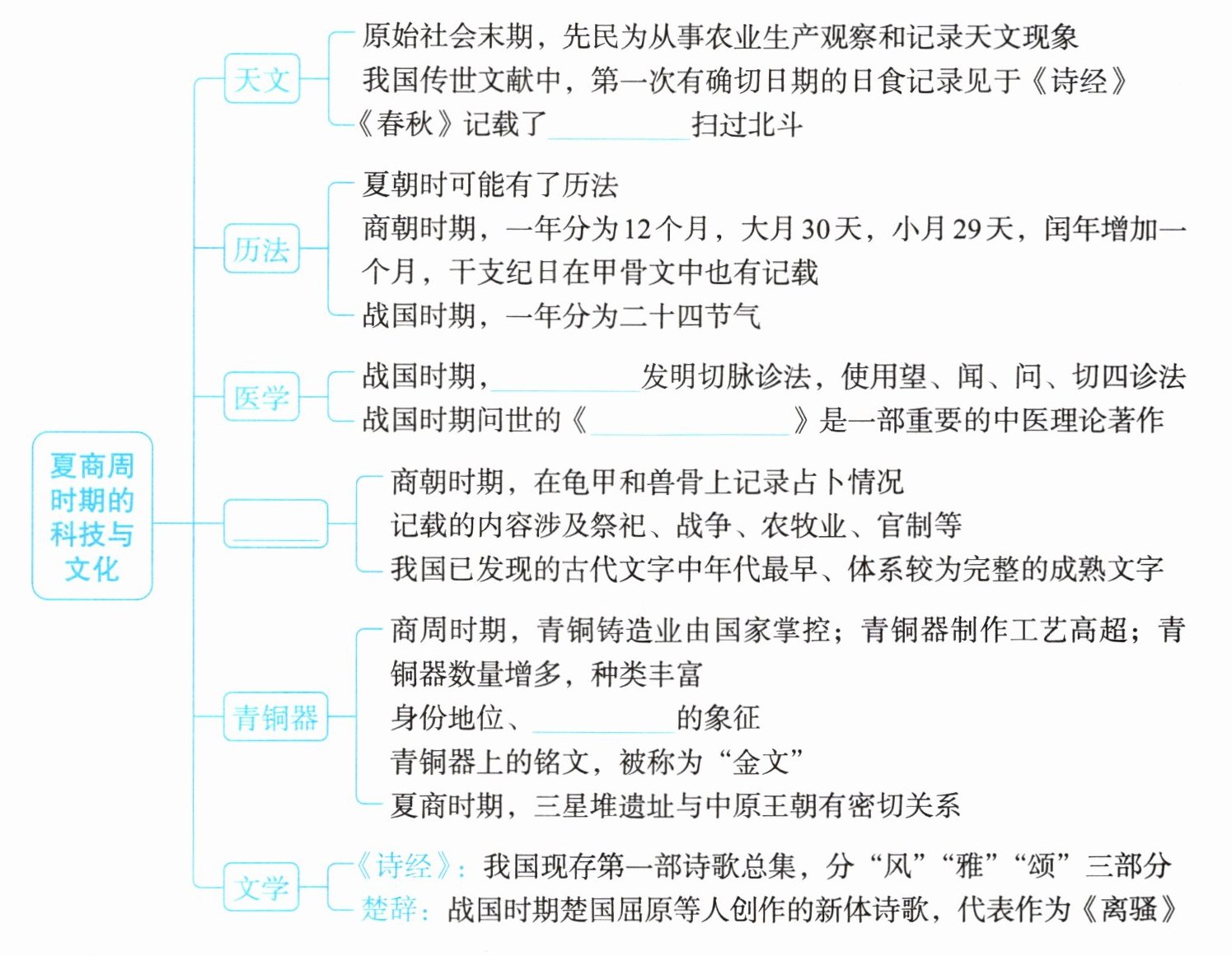- 历法:夏朝时可能有了历法;商朝时期,一年分为12个月,大月30天,小月29天,闰年增加一个月,干支纪日在甲骨文中也有记载;战国时期,一年分为二十四节气