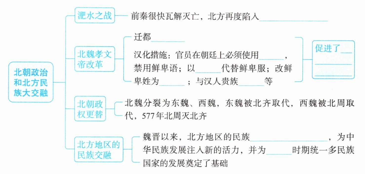 - 北方地区的民族交融:魏晋以来,北方地区的民族____,为中华民族发展注入新的活力,并为____时期统一多民族国家的发展奠定了基础