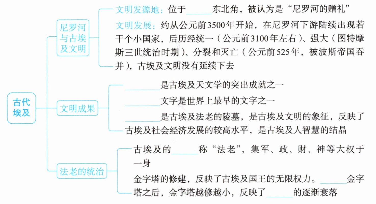 古埃及文明进程历经了曲折但未间断。古埃及最大的金字塔是哈夫拉金字塔。法老集军、政、财、神等大权于一身。