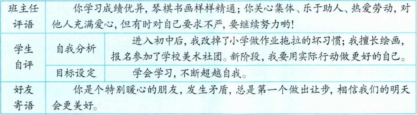 7.(1)①小深不断完善自己,主动改正缺点,改掉了小学做作业拖拉的坏习惯;②小深不断完善自己,扬长避短,根据自己擅长绘画的特点选择报名参加美术社团。(每点2分,共4分)(2)①做更好的自己,不仅是初中阶段的成长要求,而且是值得我们用一生去探寻的人生课题。②每个人都是不同的个体,超越自我的目标有利于尊重和接受个体的差异,并根据自身特点和社会需要发展自己,做更好的自己。(每点2分,共4分)