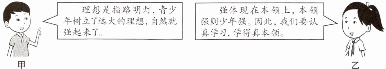 (1)甲同学的观点是片面的,他只看到了理想的重要性却忽视了少年强不仅需要树立理想,还需要通过学习实现理想。乙同学的观点是正确的,她认识到了学习的重要性。(1分)(2)观点和理由:①编织人生梦想,是青少年时期的重要主题。青少年树立远大理想能不断激发我们对生命的热情和勇气,让生活更有色彩。(2分)②但青少年的强,不仅在于有梦想,还在于通过提升本领实现梦想。实现梦想需要学习,学习不仅关乎个人的前途和命运,更关乎民族的未来和发展。(2分)③我们应学以致用、开拓进取、勇于创新,运用所学知识帮助他人、服务社会,为实现中华民族伟大复兴的中国梦贡献力量。(1分)