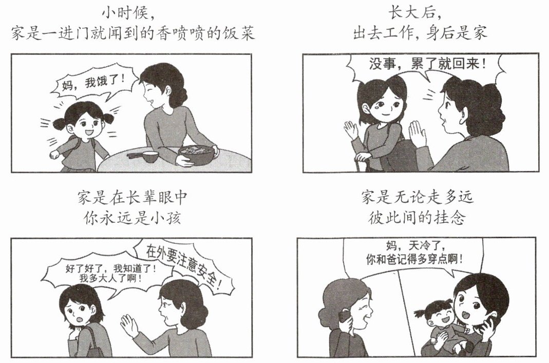 6.(1)①家是生命的居所,是心灵的港湾。家不只是一所房子,家里有亲人,家中有亲情,家让我们的心灵有所依托。(2分)②家是代代传承、血脉相连的生活共同体。(2分)③每个人都有属于自己的家,我们的生命是父母给予的,我们的成长也离不开家庭的哺育和支持。(2分)(2)①要孝敬家里的老人,多多陪伴,多多倾听他们的意见。②自己的事情要自己做。③要好好学习,把书读好,知识是最大的财富。④做人要诚实守信,与人为善。……(写出三点即可,每点2分,共6分)