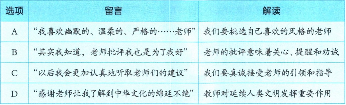 3. 教师节晚会设置了线上表白墙,同学们可实时留言,发送想对老师说的话。晚会现场随机抽取了四条留言,以下解读和留言对应不正确的是( )。