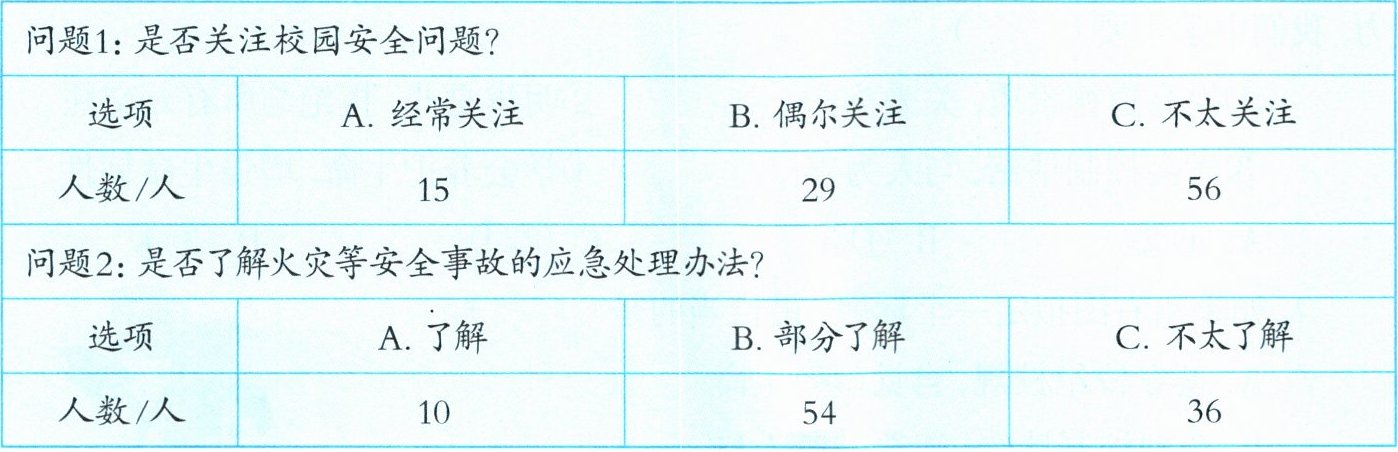 第一小组同学针对校园安全问题对100名同学进行了调研,以下是调研结果(节选):
