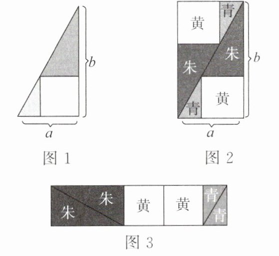 ,当内接正方形的面积为 $ 1 $ 时,图 3 中两个标有“朱”的三角形和两个标有“青”的三角形的面积总和的最小值是2