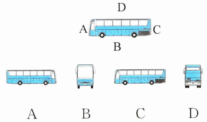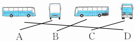 2. 从A,B,C,D四个位置观察公共汽车,看到的分别是什么样子?用线连一连。