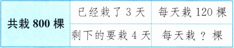 (如皋师范附属小学期末)林场今年计划植树800棵,已经栽了3天,每天栽120棵。剩下的打算4天栽完,平均每天栽多少棵?
