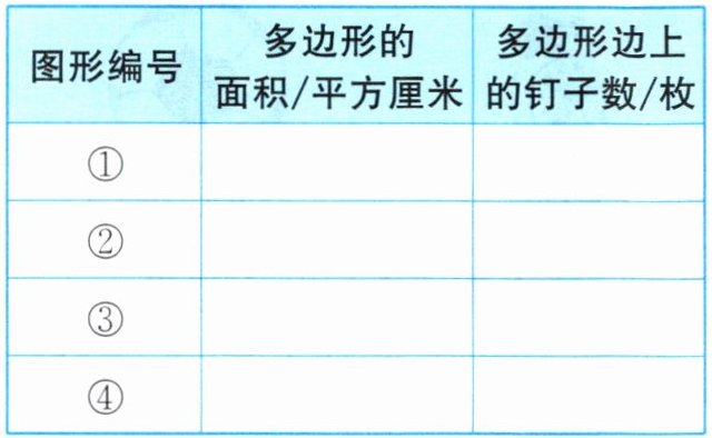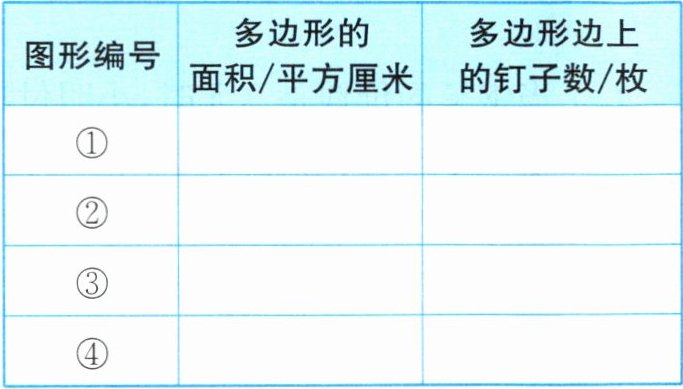 )枚钉子。用$n$表示多边形边上的钉子数,用$S$表示多边形的面积,那么$S=$(n÷2+1