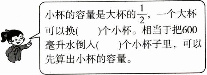 1. 小明把 600 毫升水倒入 4 个小杯和 1 个大杯,正好都倒满,小杯的容量是大杯的$\frac {1}{2}$。大杯和小杯的容量各是多少毫升?