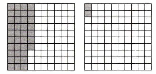 1. 下面的每个大正方形都表示“1”,把各图中的涂色部分先用百分数表示,再用小数表示。