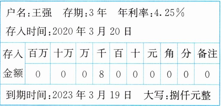 4. 根据下表计算王强到期后可得利息和本金共多少元?