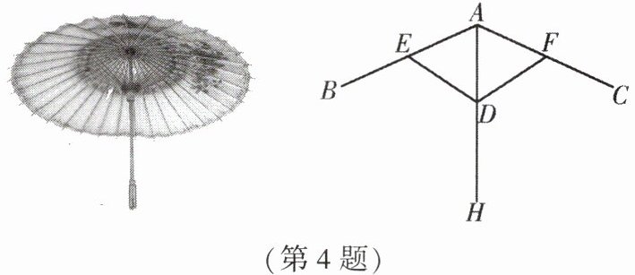 4. (★)某中学八年级同学在听了“天宫课堂”第三课后,组成了数学兴趣小组进行了设计伞的实践活动.康康所在的小组设计了截面如图所示的伞骨结构,当伞完全打开后,测得 AB = AC,E,F 分别是 AB,AC 的中点,ED = DF,那么△AED ≌ △AFD 的依据是【