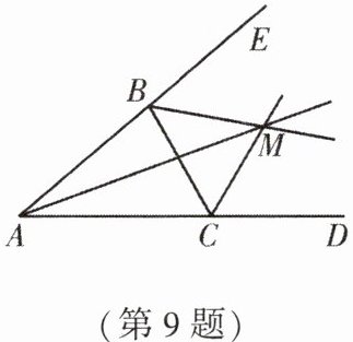 9. (★★)如图,在△ABC中,AB<AC,∠BAC的平分线与△ABC的外角∠BCD的平分线相交于点M,延长AB得到射线AE,作射线BM,有下列四个结论:①∠MCD>∠MAB;②BM= CM;③射线BM是∠EBC的平分线;④∠BMC= 90°-$\frac{1}{2}$∠BAC.其中正确结论的序号是