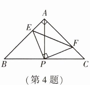 4. (★★)如图,已知在△ABC中,AB= AC,∠BAC= ∠EPF= 90°,∠EPF的顶点P是BC的中点,两边PE,PF分别交AB,AC于点E,F,当∠EPF在△ABC内绕顶点P旋转时(点E不与A,B重合),给出以下四个结论:①AE= CF;②△EPF是等腰直角三角形;$③2S_{四边形AEPF}= S_{△ABC};$④BE+CF= EF.其中始终正确的有【