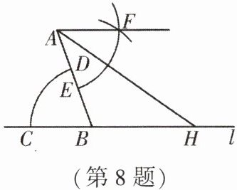 8. (★)如图,点B在直线l上,分别以线段BA的端点为圆心,以BC(小于线段BA)的长为半径作弧,分别交直线l,线段BA于C,D,E三点,再以点E为圆心,CD的长为半径作弧交前面的弧于点F,画射线AF.若∠BAF的平分线AH交直线l于点H,∠ABC= 70°,则∠AHB的度数为