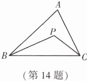 14. (★★★) “十一”假期,小梦一家计划从家 $ B $ 出发,到景点 $ C $ 旅游,由于 $ B,C $ 之间是条河,无法通过,如图所示,只有 $ B \to A \to C $ 和 $ B \to P \to C $ 两条路线,哪一条比较近?为什么?(提示:延长 $ BP $ 交 $ AC $ 于点 $ D $)
