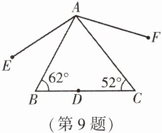 9. (★)如图,在△ABC 中,点 D 在 BC 上,将点 D 分别以 AB,AC 为对称轴,画出对称点 E,F,并连接 AE,AF,根据图中标示的角度,∠EAF 的度数为【