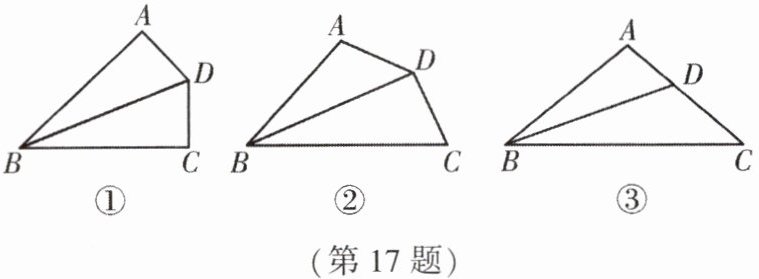 17. 如图①和图②,在四边形 $ ABCD $ 中,$ \angle BAD = \alpha $,$ \angle BCD = 180° - \alpha $,$ BD $ 平分 $ \angle ABC $。