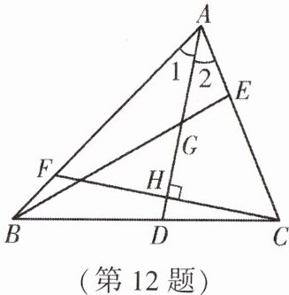 12. (★★) 如图,在 $ \triangle ABC $ 中,$ \angle 1 = \angle 2 $,$ G $ 为 $ AD $ 的中点,连接 $ BG $ 并延长 $ BG $ 交 $ AC $ 于点 $ E $,$ F $ 为 $ AB $ 上的一点,$ CF \perp AD $ 于点 $ H $。下列判断错误的是 【