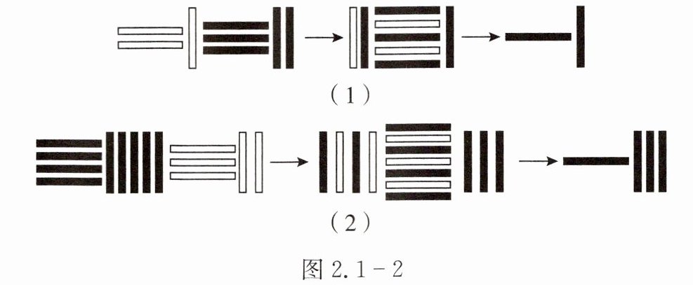 8. 魏晋时期的数学家刘徽在其著作《九章算术注》中用不同颜色的算筹(小棍形状的记数工具)分别表示正数和负数(白色为正,黑色为负),图 $2.1 - 2(1)$ 表示的是 $( + 21)+( - 32)= - 11$ 的计算过程,则图 $2.1 - 2(2)$ 表示的计算过程是(