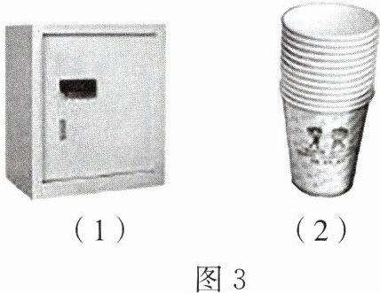 【情境描述】圆圆想把一些相同规格的塑料杯,尽可能多地放入高$40\ cm$的柜子里(如图(1)). 她把杯子如图这样整齐地叠放成一摞(如图(2)),但她不知道一摞最多能叠几个可以一次性放进柜子里.