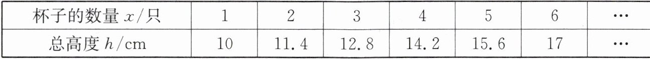 (1)由表格可得,每增加一个杯子,总高度增加1.4,则总高度h = 10 + (x - 1)×1.4 = 8.6 + 1.4x。所以用含x的代数式表示h为8.6 + 1.4x。
