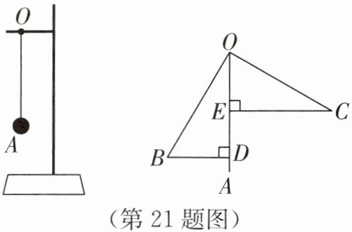 21. (10分)如图,在一个支架的横杆点O处用一根绳悬挂一个小球A,小球A可以摆动,如图,OA表示小球静止时的位置. 当小球从OA摆到OB位置时,过点B作BD⊥OA于点D. 当小球摆到OC位置时,OB与OC恰好垂直,过点C作CE⊥OA于点E,测得CE=24 cm,OA=OB=OC=30 cm.