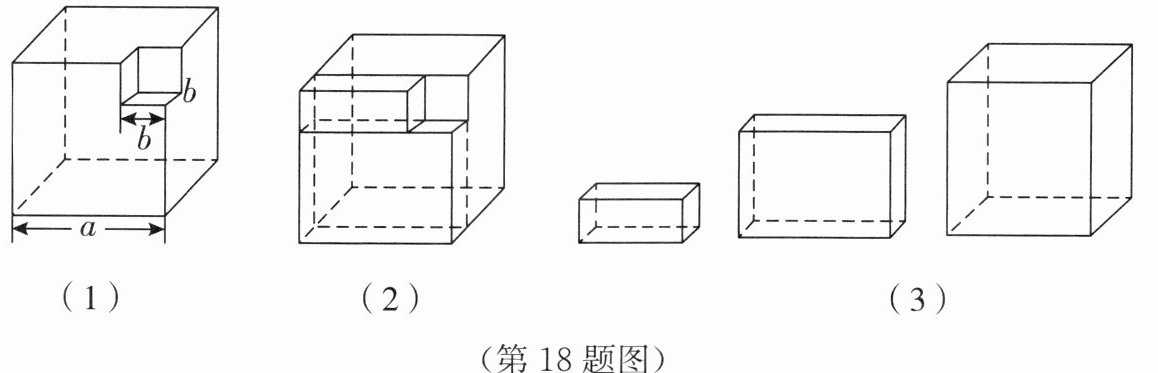 18. (16 分)在一个棱长为 $a$ 的正方体中挖出一个棱长为 $b$ 的小正方体,如图(1)所示,然后切割剩余的立体图形,如图(2)所示,将之分成三部分,如图(3)所示,这三部分长方体的体积依次为 $b^{2}(a - b)$,$ab(a - b)$,$a^{2}(a - b)$.