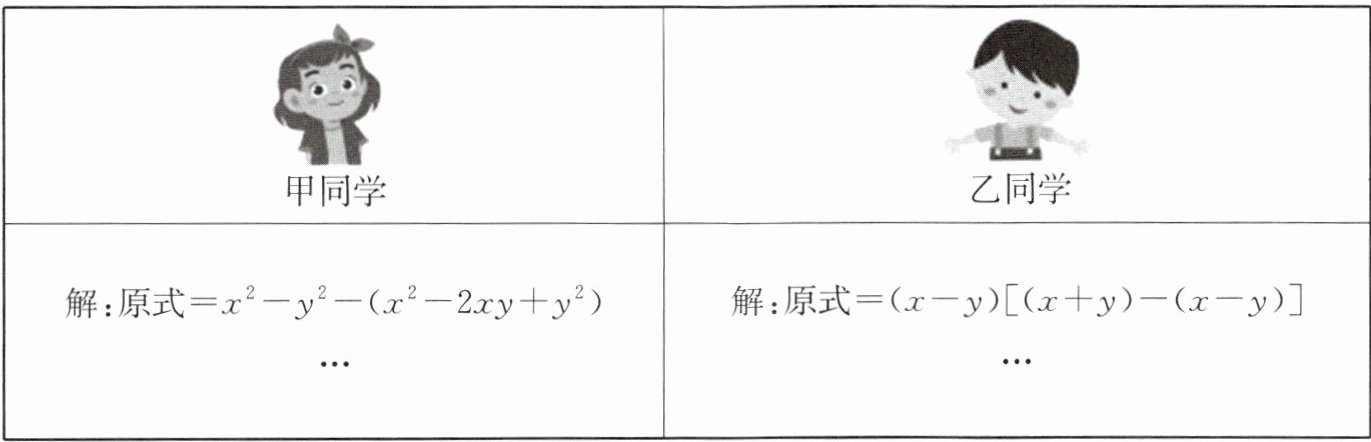 (2)选择甲同学的解法:原式$=x^{2}-y^{2}-(x^{2}-2xy+y^{2})=x^{2}-y^{2}-x^{2}+2xy-y^{2}=2xy-2y^{2}.$选择乙同学的解法:原式$=(x-y)[x+y-(x-y)]=(x-y)(x+y-x+y)=(x-y)·2y=2xy-2y^{2}.$