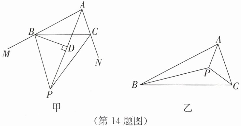 (1)如图甲,若 AP 平分∠BAC,BP,CP 分别平分△ABC 的外角∠CBM 和∠BCN,BD⊥AP 于点 D。