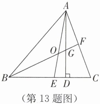 13. 如图,在△ABC 中,AD 是高,AE,BF 是△ABC 的角平分线,它们相交于点 O,BF 与 AD 交于点 G,∠C = 70°。