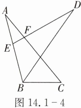 6. 如图 14.1 - 4,$\triangle ABC\cong\triangle DEB$,点 E 在 AB 边上,DE 与 AC 交于点 F.