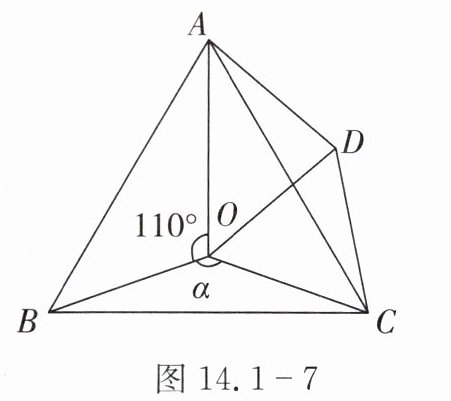 9. 如图 14.1 - 7,点 O 是等边$\triangle ABC$内一点,D 是$\triangle ABC$外的一点,$\angle AOB = 110^{\circ}$,$\angle BOC = \alpha$,$\triangle BOC\cong\triangle ADC$,连接 OD 得到等边三角形$\triangle OCD$,当$\alpha =$