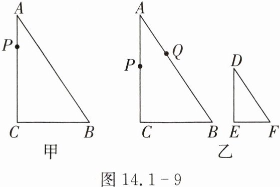 时,$\triangle APC$的面积等于$\triangle ABC$面积的一半.(3)如图乙,在$\triangle DEF$中,$\angle E = 90^{\circ}$,$DE = 4$cm,$DF = 5$cm,$\angle D = \angle A$. 在$\triangle ABC$的边上,若另外有一个动点 Q,与点 P 同时从点 A 出发,沿着边$AB→BC→CA$运动,回到点 A 停止. 在两点运动过程中的某一时刻,恰好$\triangle APQ$与$\triangle DEF$全等,请直接写出点 Q 的运动速度.