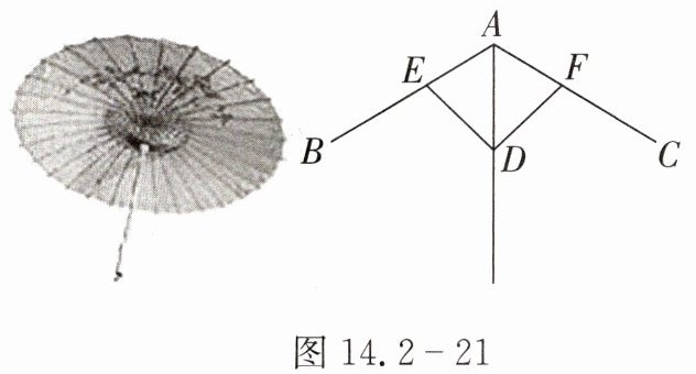 4. 八年级(2)班的数学兴趣小组开展了设计伞的实践活动.小康所在的小组设计了截面如图14.2-21所示的伞骨结构,当伞完全打开后,测得AB=AC,E,F分别是AB,AC的中点,ED=FD,那么△AED≌△AFD的依据是(