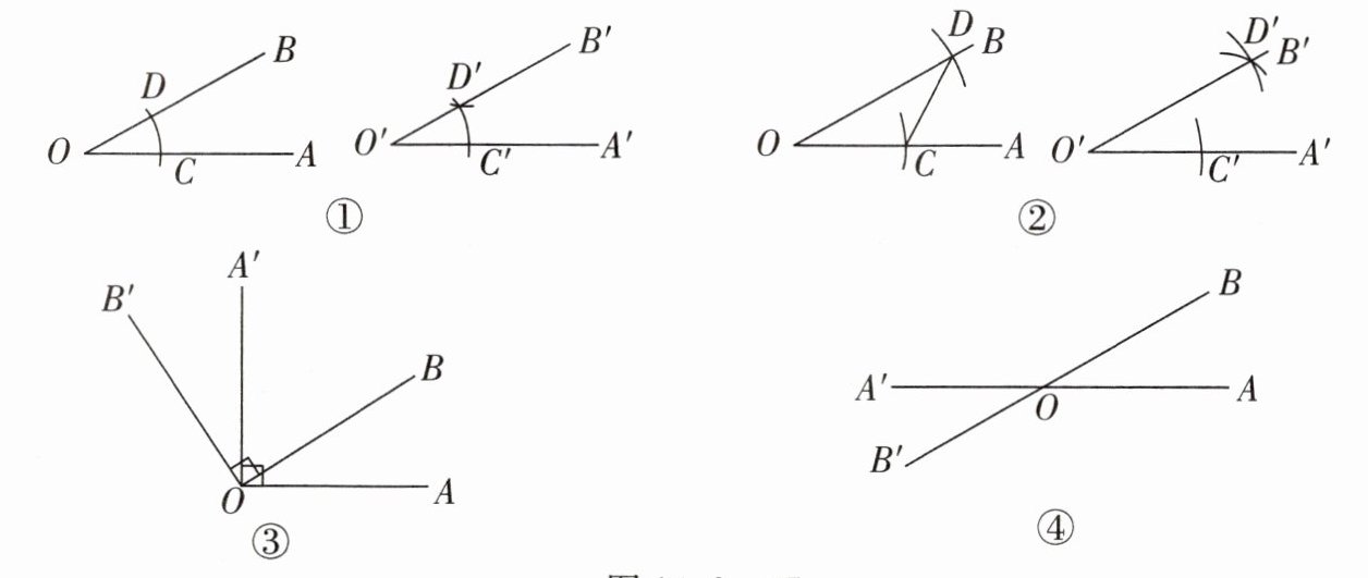 7. 如图14.2-35,用不同的方式作一个与∠AOB相等的角,其中正确的个数为(