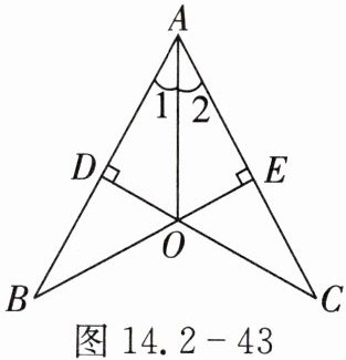 5. 如图14.2-43,点D,E分别在AB,AC上,∠ADC=∠AEB=90°,BE,CD相交于点O,OB=OC.求证:∠1=∠2.