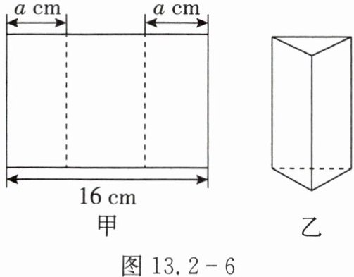 10. 如图 13.2 - 6 甲,将长为 16 cm 的长方形纸片沿虚线折成 3 个长方形,其中左右两侧长方形的宽相等. 若要将其围成如图乙所示的三棱柱形物体的侧面. 请确定图中整数 a 的值.