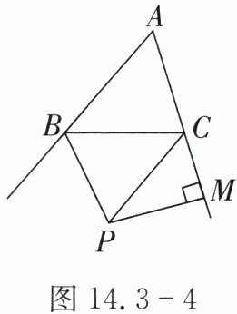 4. 如图 14.3 - 4,在$\triangle ABC$中,$\triangle ABC$的两个外角的平分线交于点$P$,$PM\perp AC$于点$M$。若$PM = 6\ cm$,则点$P$到$AB$的距离为
