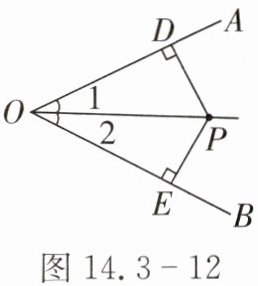 1. 如图 14.3 - 12,在$\angle AOB$的内部有一点$P$,$PD\perp OA$于$D$,$PE\perp OB$于$E$,$PD = PE$。猜想:$\angle 1$与$\angle 2$有何关系?试着证明你的猜想。