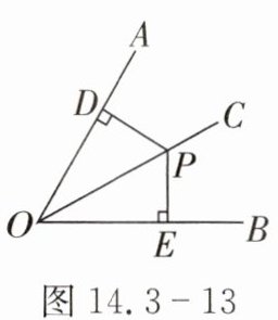 2. 如图 14.3 - 13,已知$PD\perp OA$,$PE\perp OB$,垂足分别为$D$,$E$,$PD = 7\ cm$。当$PE =$