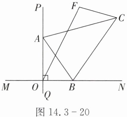 9. 如图 14.3 - 20,直线$MN\perp PQ$,垂足为$O$,点$A$是射线$OP$上一点,$OA = 2$,以$OA$为边在$OP$右侧作$\angle AOF = 24^{\circ}$,且满足$OF = 4$,若点$B$是射线$ON$上的一个动点(不与点$O$重合),连接$AB$,作$\triangle AOB$的两个外角平分线交于点$C$,在点$B$在运动过程中,当线段$CF$取最小值时,$\angle OFC$的度数为
