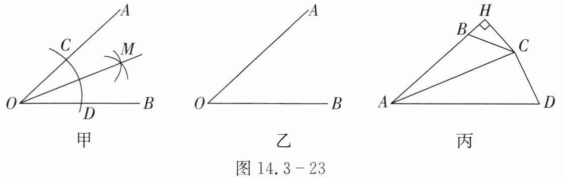 如图甲,以$O$为圆心,任意长为半径作弧,分别交射线$OA$,$OB$于点$C$,$D$。分别以点$C$,$D$为圆心,大于$\frac{1}{2}CD$的长为半径作弧,两弧在$\angle AOB$内部交于点$M$。作射线$OM$。则射线$OM$为$\angle AOB$的平分线。